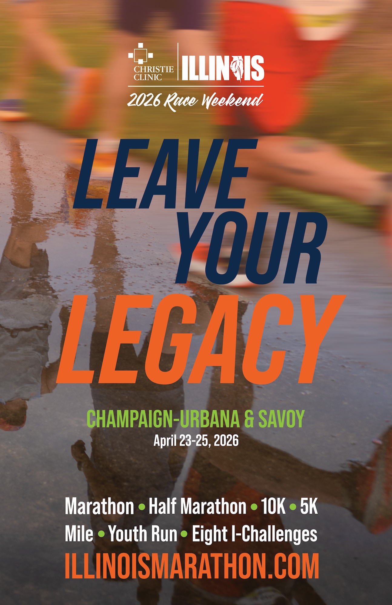 Along with the theme, Christie Clinic Illinois Race Weekend has revealed its official race poster, which visually captures the “Leave Your Legacy” theme. Around 1,500 copies of the poster will be available on a first-come, first-served basis at the Health and Fitness Expo. This year, the poster features an image of runners’ legs and shoes traversing the course in Meadowbrook Park, with a mirrored reflection of their movements on the path below. This visual represents the mark that participants make on their journey to the finish line and the legacy they create with each step.