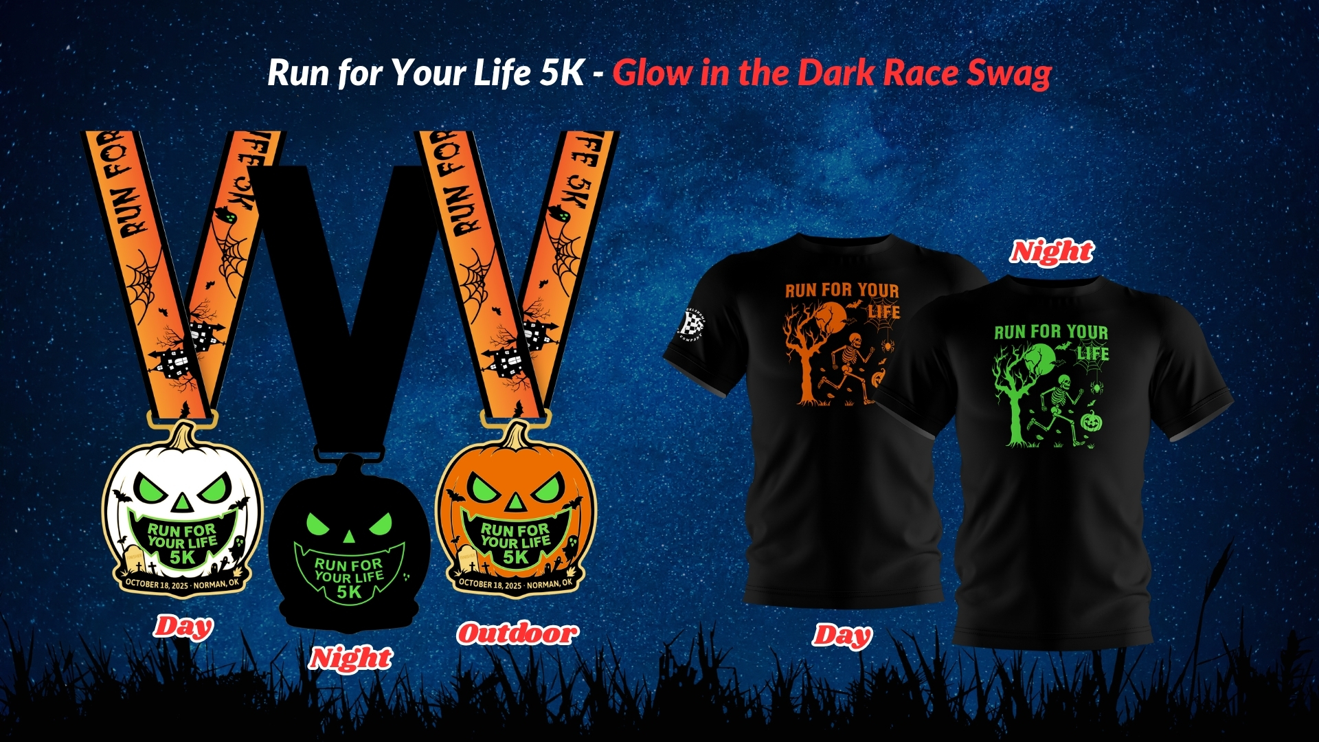 NORMAN, OK (October 7, 2025) /ENDURANCE SPORTSWIRE/ — The Run for Your Life 5K, part of the beloved Zombie Run experience, is set to thrill participants again this October — now with a new level of spooky excitement. This year’s race swag, including glow-in-the-dark shirts and medals, was designed and produced by X T-shirt, bringing the event’s haunting theme vividly to life, both day and night.